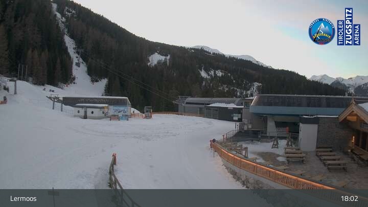 Hier siehst du die Bergstation des Hochmoos Express im Skigebiet Lermoos in der Tiroler Zugspitz Arena.