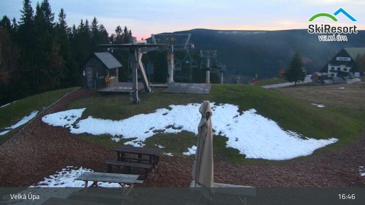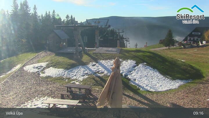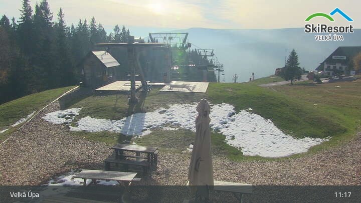 Hier siehst du den Blick von der Bergstation in Velká Úpa über die Pisten des tschechischen Skigebiets.