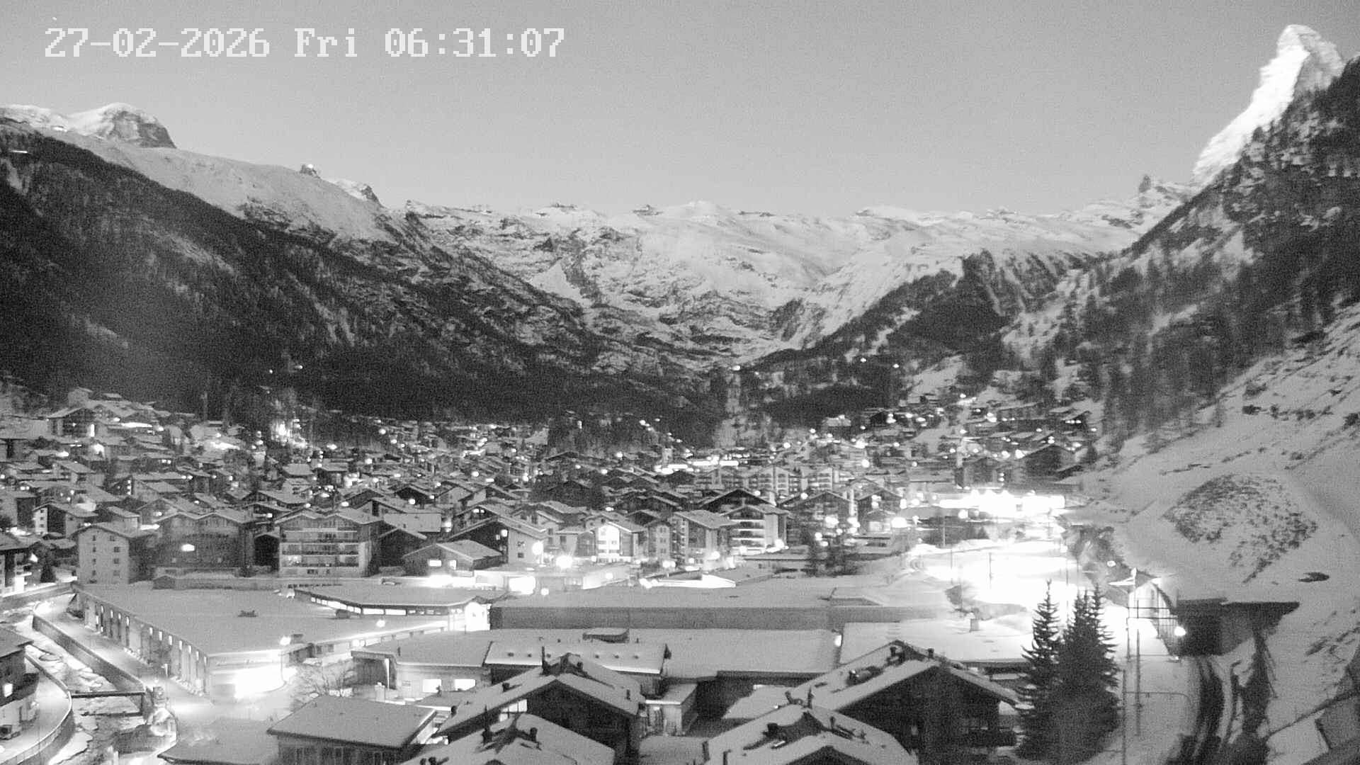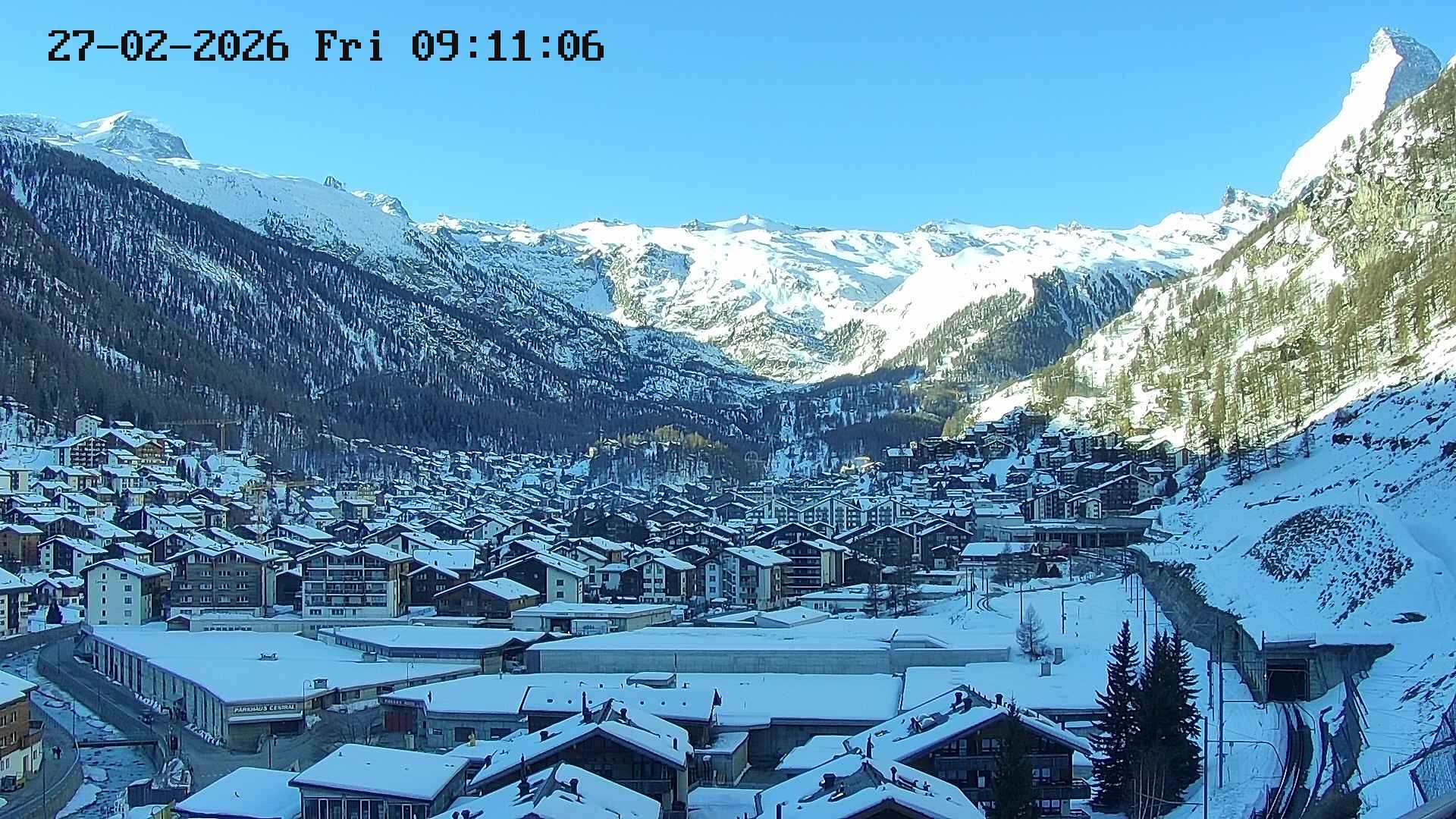 Webcam zeigt den Norden des Dorfes Zermatt. Der Blick geht vom Ortsteil Spiss in Richtung Süd-Südwest.