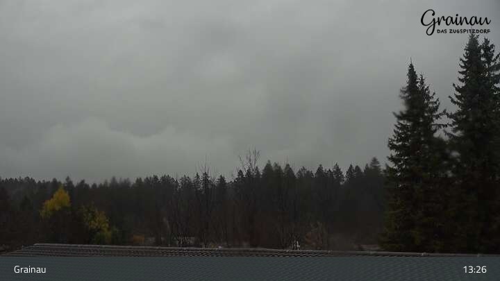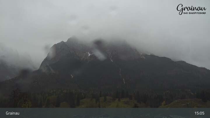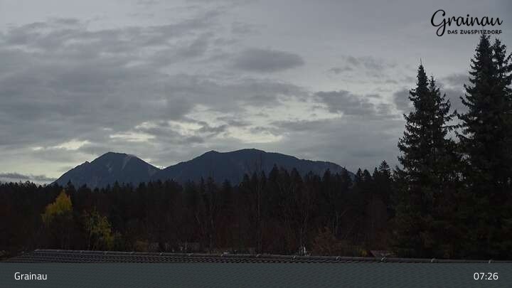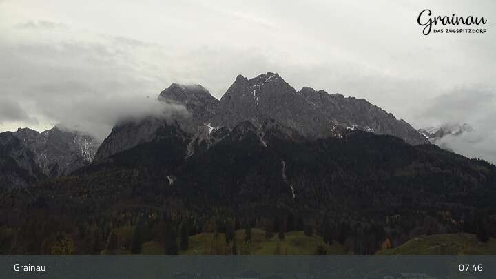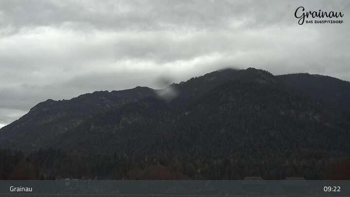 Panoramablick vom Freibad in Grainau auf das Dorf und die umliegende Bergwelt mit Zugspitze sowie dem großen und kleinen Waxenstein.