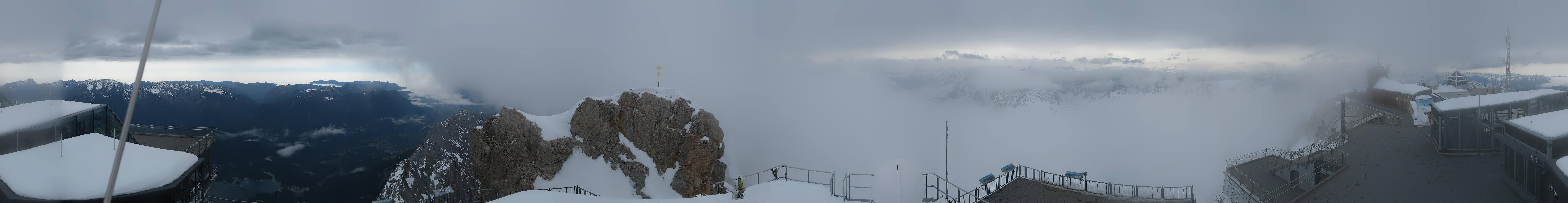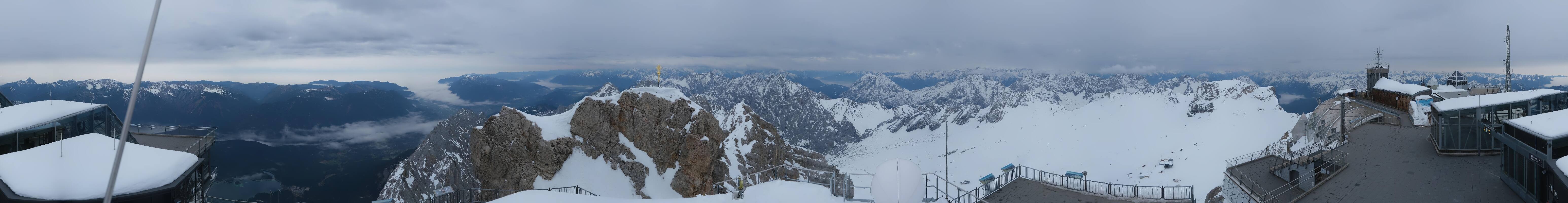 Panoramablick vom höchsten Deutschen Berg - der Zugspitze. Im Süden sieht man die Tiroler Alpen, im Norden reicht der Blick bis ins bayrische Alpenvorland.