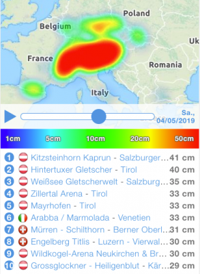 Die größte Auswahl an geöffneten Pistenkilometern gibt es im Mai in Österreich. Zwar laufen "nur" noch auf sieben Gletschern die Skilifte, dafür sind aber beispielsweise am Hintertuxer Gletscher und am Kitzsteinhorn noch fast alle Abfahrten geöffnet. Die Schneehöhen sind mit bis 600 Zentimetern auch enorm. Durch den Wintereinbruch Anfang Mai kommt zudem noch jede Menge Neuschnee hinzu.