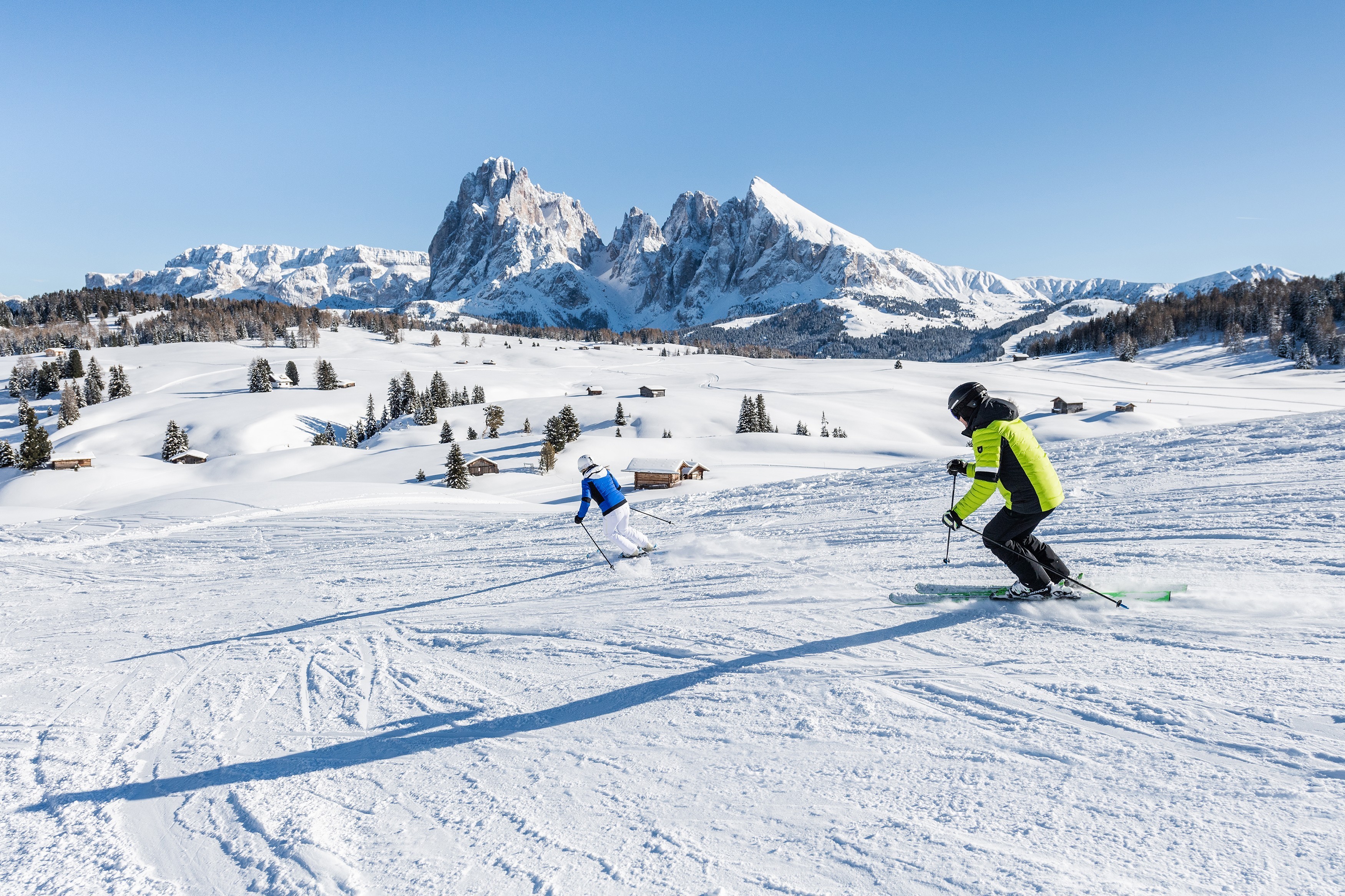 Aktiven Winterurlaubern sind hier nahezu keine Grenzen gesetzt, denn auf der Seiser Alm erwarten dich das größte Skigebiet Südtirols, 80 Loipenkilometer, 60 Kilometer präparierte Winterwanderwege und nicht zuletzt kulinarische Genusserlebnisse in den urigen Hütten direkt auf der Alm sowie in den umliegenden Ortschaften Kastelruth, Seis am Schlern, Völs am Schlern und Tiers am Rosengarten.