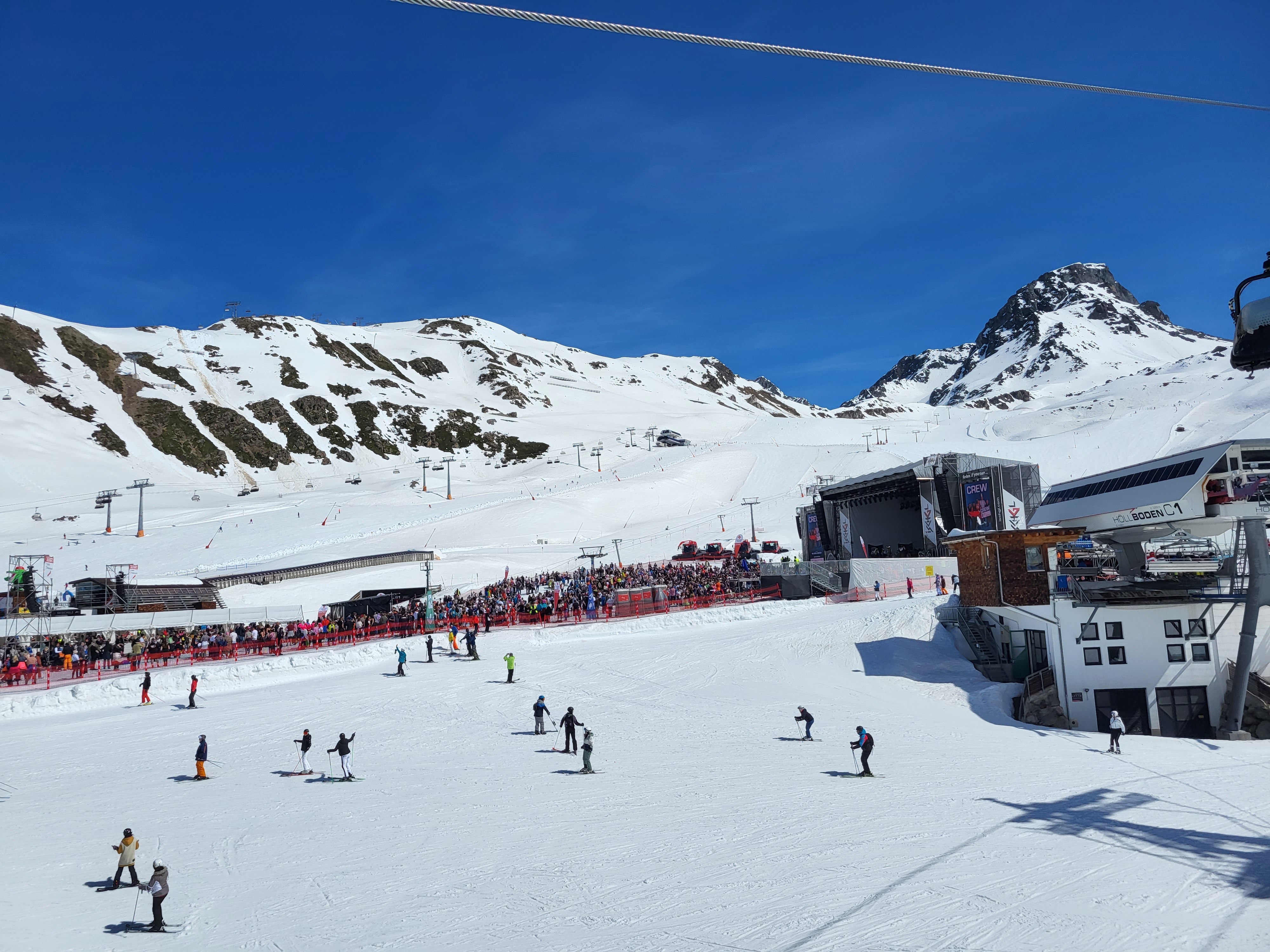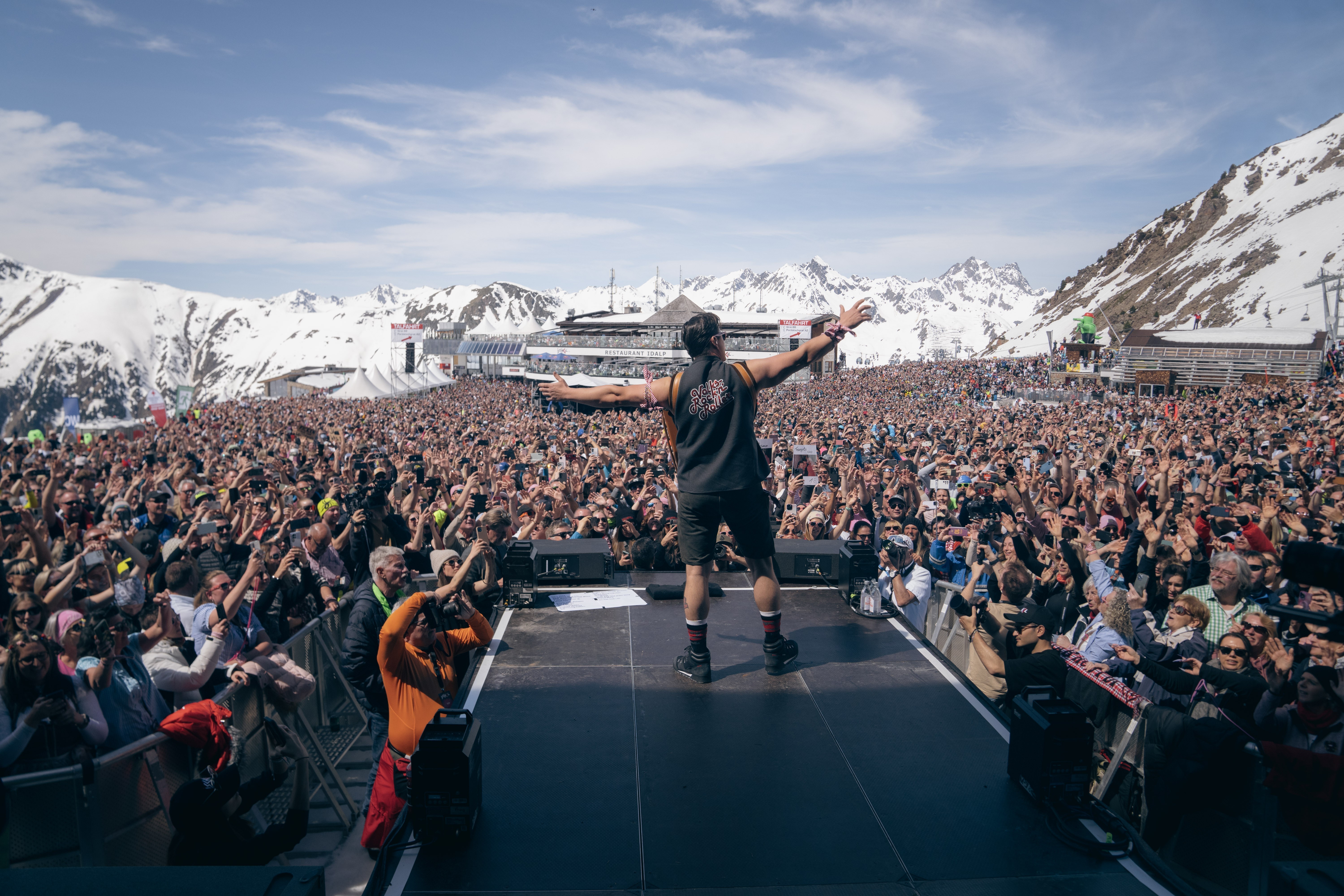 Bei diesem Traumwetter wollten viele Gäste auch nach Abschluss des Konzerts nicht sofort zurück ins Tal. Sie genossen ihre Zeit wieder beim Skifahren, auf den Sonnenterrassen der Hütten oder verblieben weiter im Veranstaltungsgelände, wo ein DJ für gute Laune und Partystimmung sorgte.