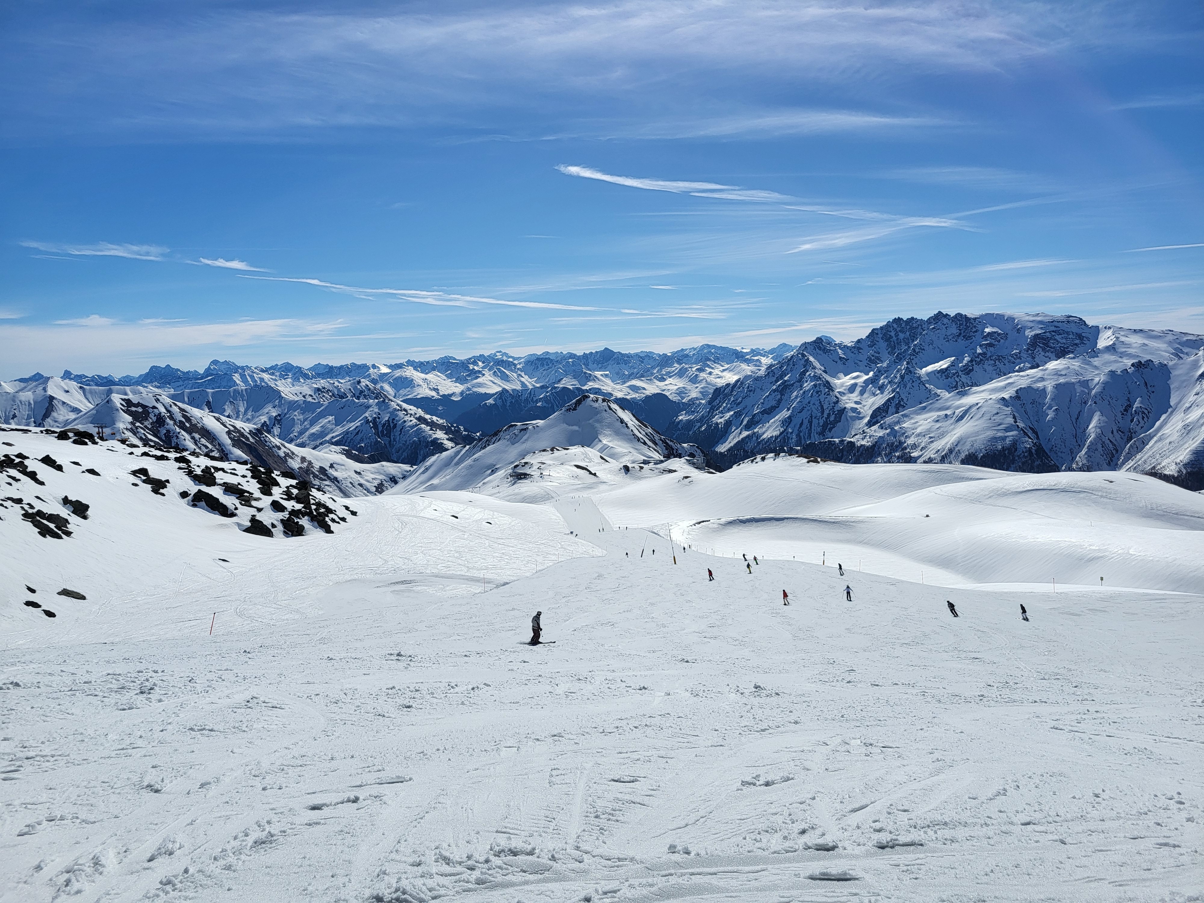 Die Vorfreude beim Blick auf den Wetterbericht war riesig! Bei strahlendem Sonnenschein ging es für uns als eine der ersten Gruppen mit der Silvrettabahn direkt ins große Skigebiet von Ischgl. Dort erwarteten uns trotz Kaiserwetter und warmen Temperaturen tolle Pistenbedingungen bis zum frühen Nachmittag. Da über 90 Prozent der grenzübergreifenden Silvretta Arena auf über 2.000 Meter Seehöhe liegen, kannst du diese Schneegarantie sogar noch bis 1. Mai erleben!