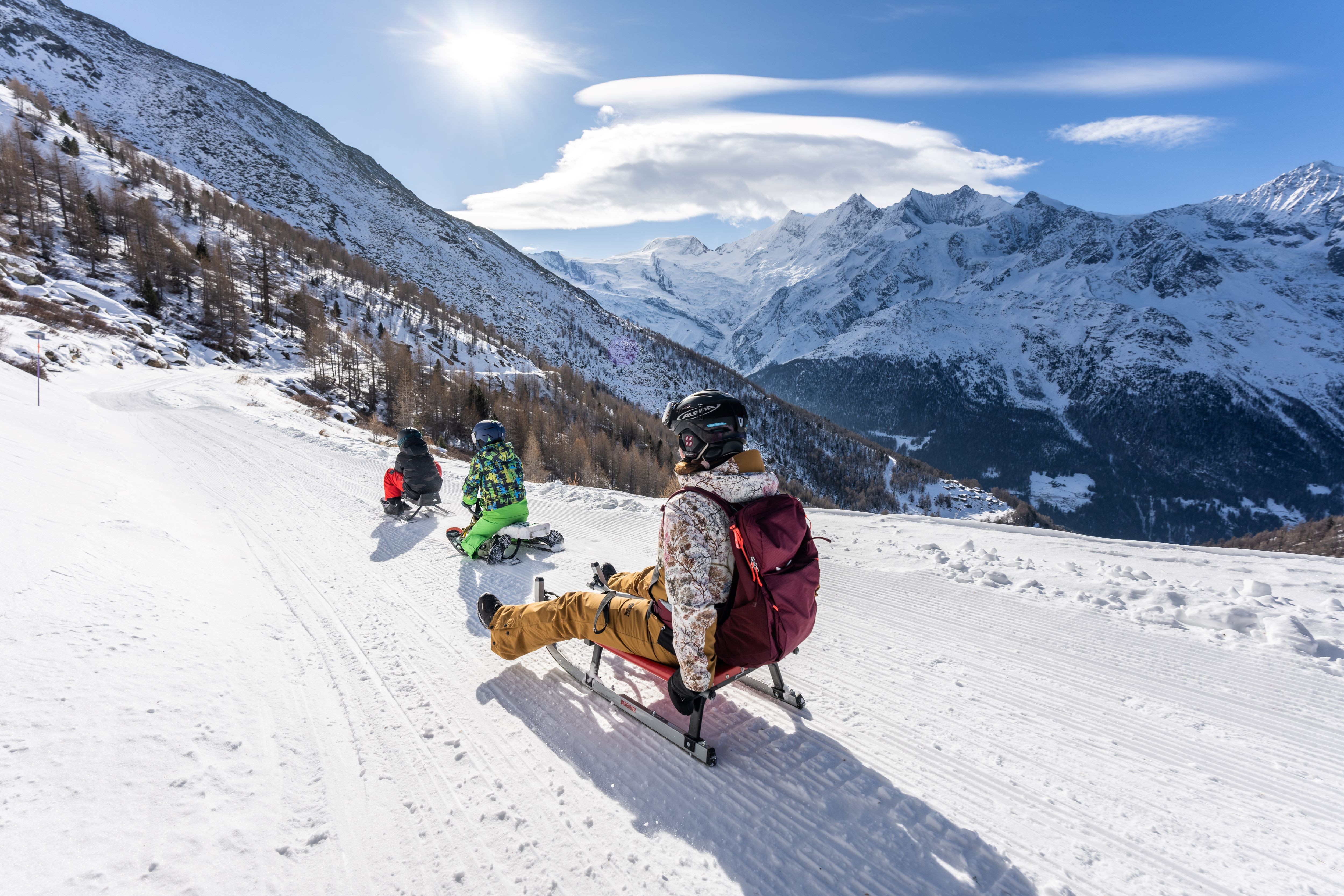 Auch ohne Ski saust du hier die Pisten runter! Schlitteln im Saastal sorgt bei Groß und Klein für strahlende Gesichter und jede Menge Spaß. Die Strecken sind zwischen drei und elf Kilometer lang und bieten rasante Action. Die Schlitten könnt ihr bequem an den Bergbahnen ausleihen, bevor ihr die spektakulären Abfahrten in Saas-Fee, Saas-Grund und Saas-Almagell in Angriff nehmt.