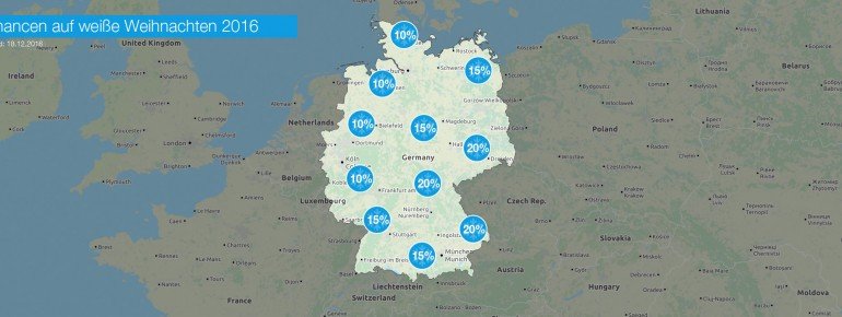 Die Chancen auf weiße Weihnachten 2016 Gibt es in diesem Jahr weiße Weihachten? Das ist die Frage, die sich in den Tagen vor Weihnachten nicht nur die Meteorologen stellen. Schnee und Weihnachten, das gehört für die meisten Menschen einfach zusammen. Dennoch ist es ein recht... mehr...