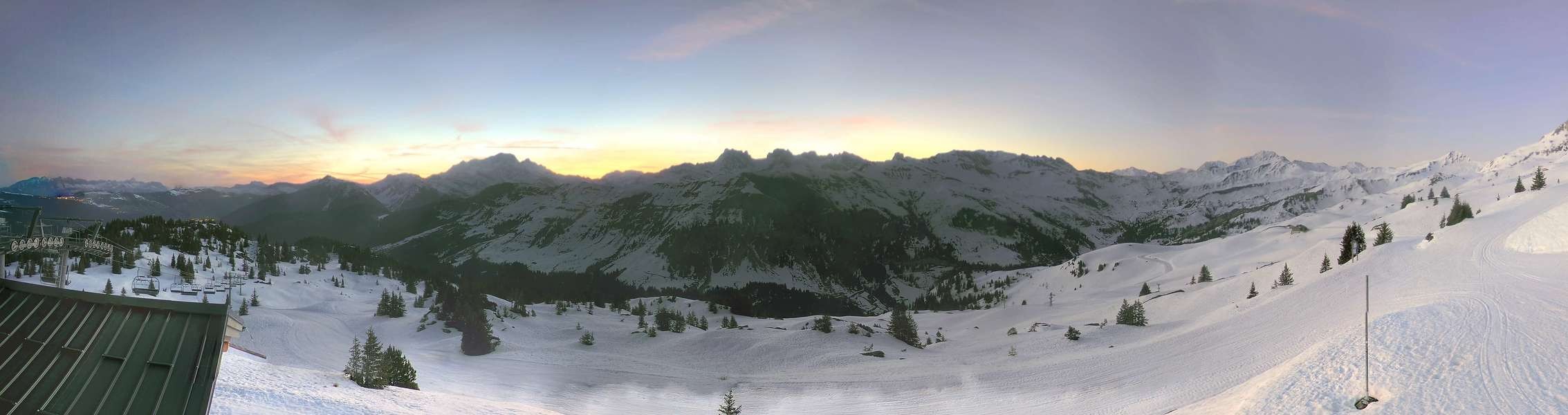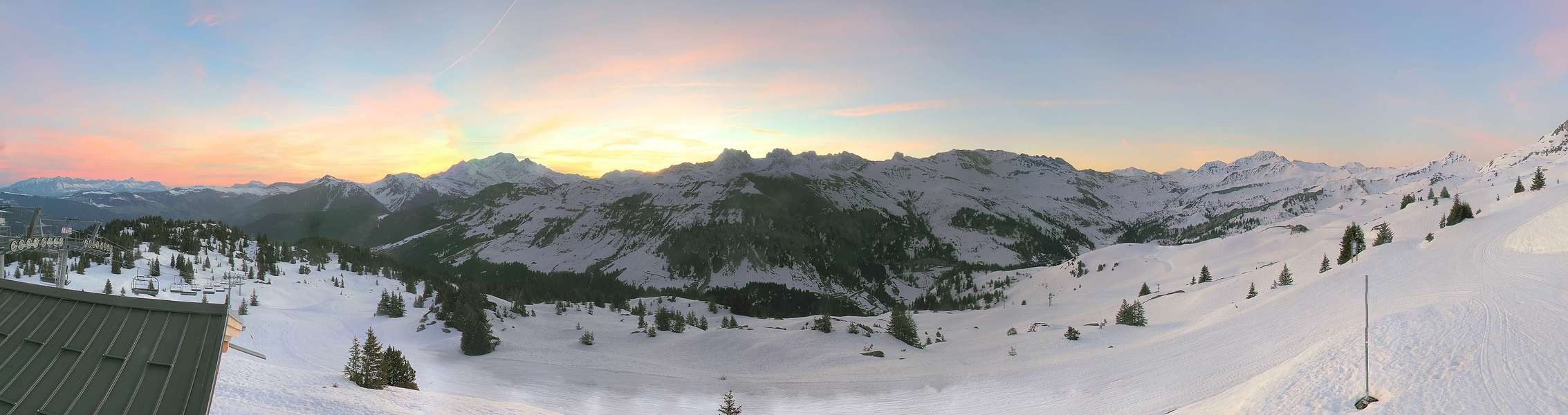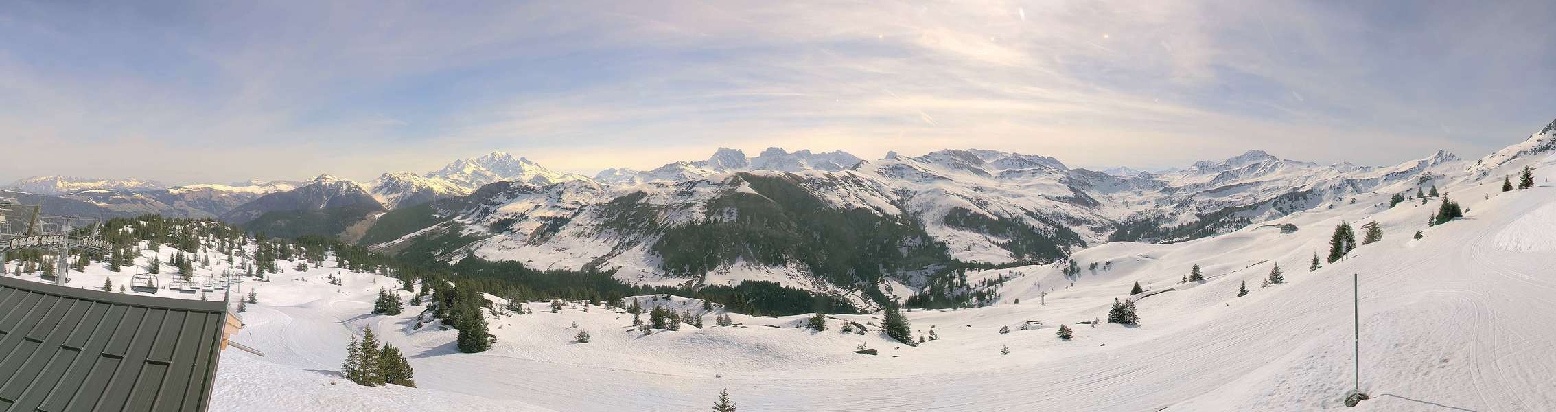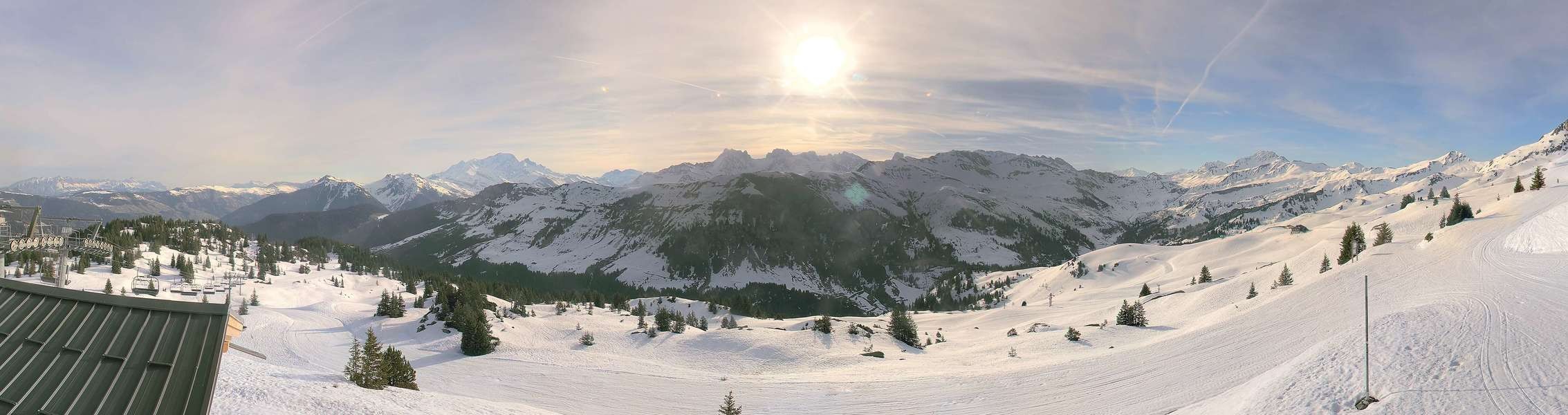 Panoramablick vom höchsten Punkt des Skigebiets Arêches Beaufort bei der Bergstation des Schlepplifts Forclaz.