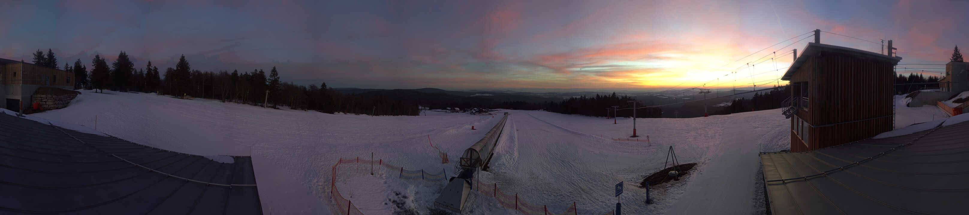 Aussicht von der Bergstation des Almberglifts im Skigebiet Mitterdorf im Bayerischen Wald.