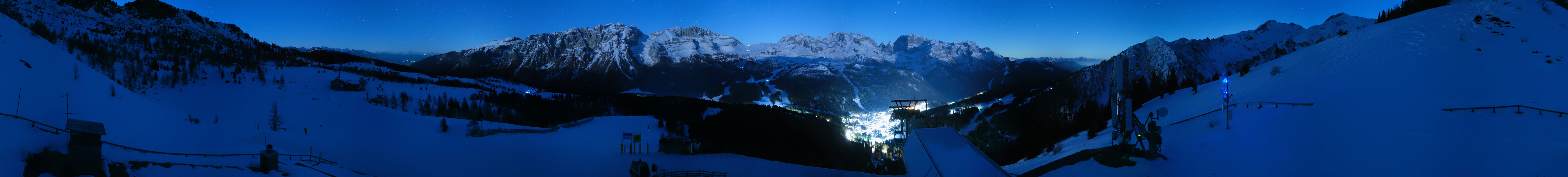Ausblick von der Bergstation der Gondelbahn Pradalago Express im Skigebiet Madonna di Campiglio. Hier starten die blaue Piste Pradalago Facile und die schwarze Abfahrt Amazzonia. Im Hintergrund siehst du die Sessellifte Fortini Express und Zeledria Express sowie das Rifugio Viviani.