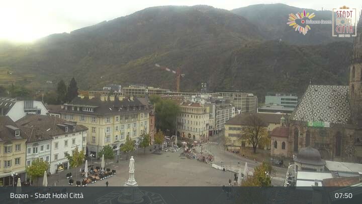 Die Webcam blickt vom Stadt Hotel Città auf den Waltherplatz in Bozen. Die Kamera zeigt auch den Bozener Dom Maria Himmelfahrt.