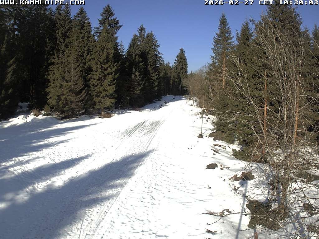 Die Kamera zeigt den Abschnitt der Kammloipe am Flößweg südöstlich von Carlsfeld.