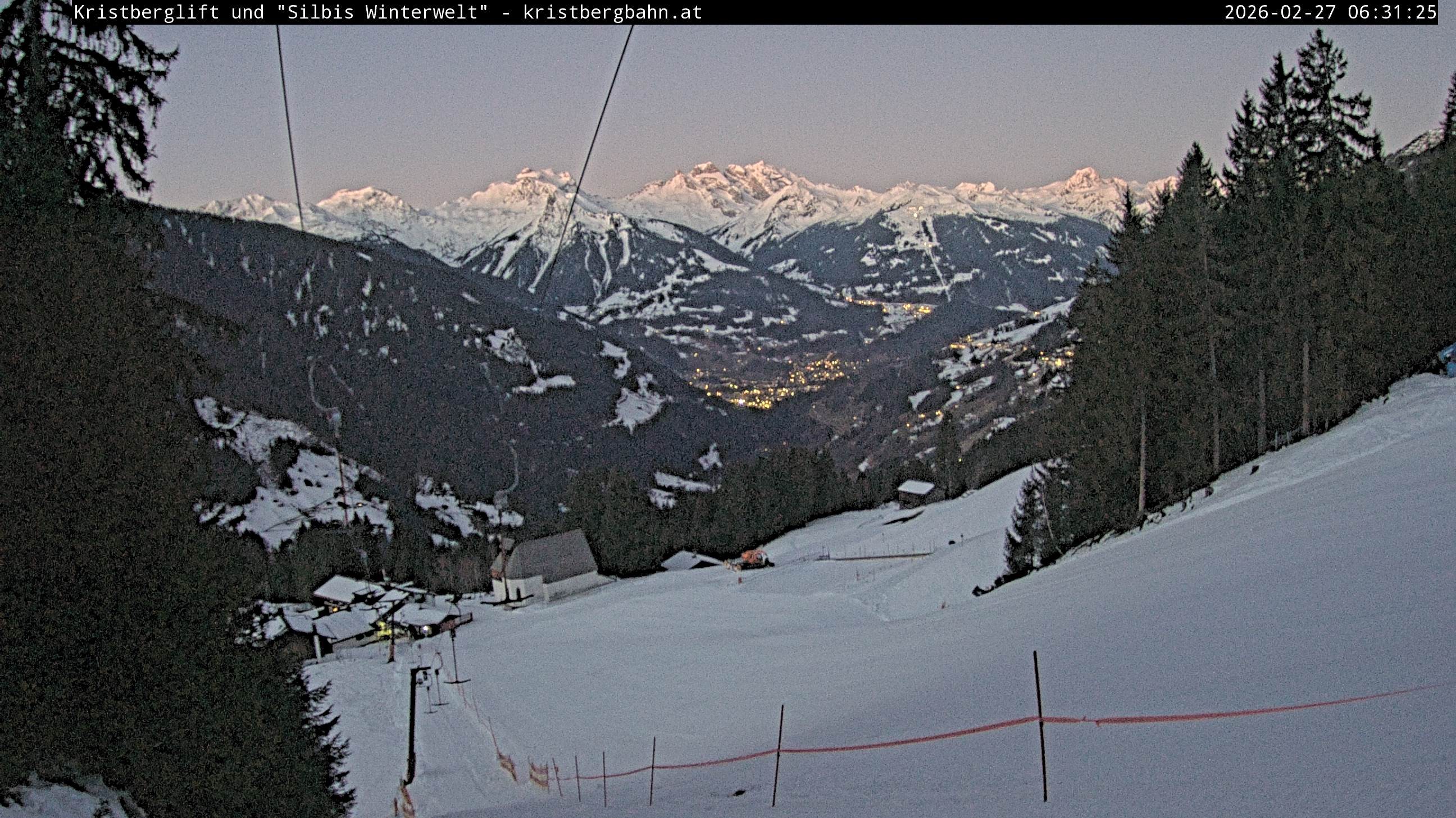 Die Webcam zeigt dir den Blick auf den Kristberglift und die Skipiste im Skigebiet Silbertal-Kristberg. Zu sehen ist außerdem das Panoramagasthaus Kristberg, die St. Agatha Knappenkapelle und die Verwall-und Rätikongebirgsgruppe mit Schruns-Tschagguns, Latschau und Golm.