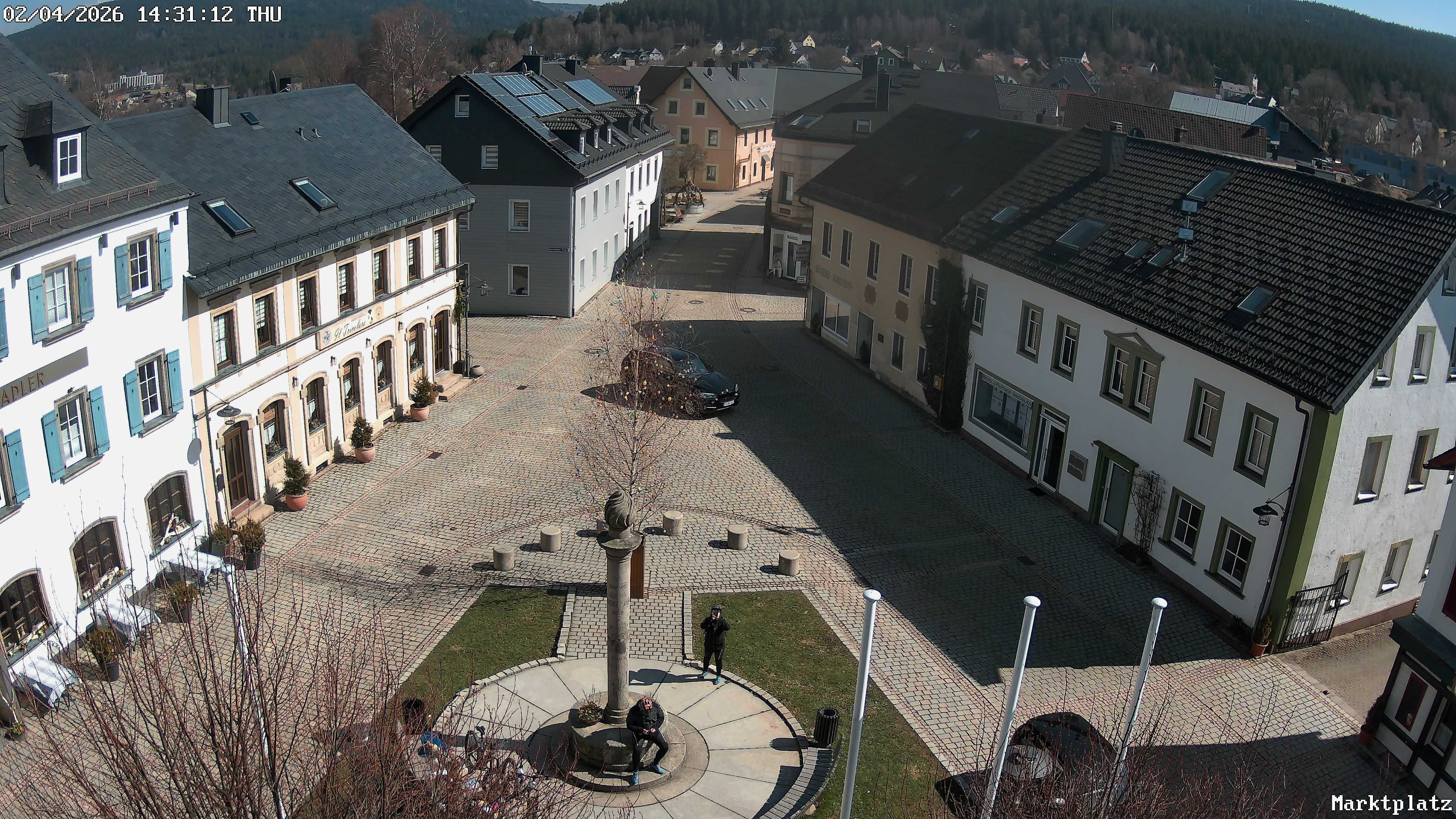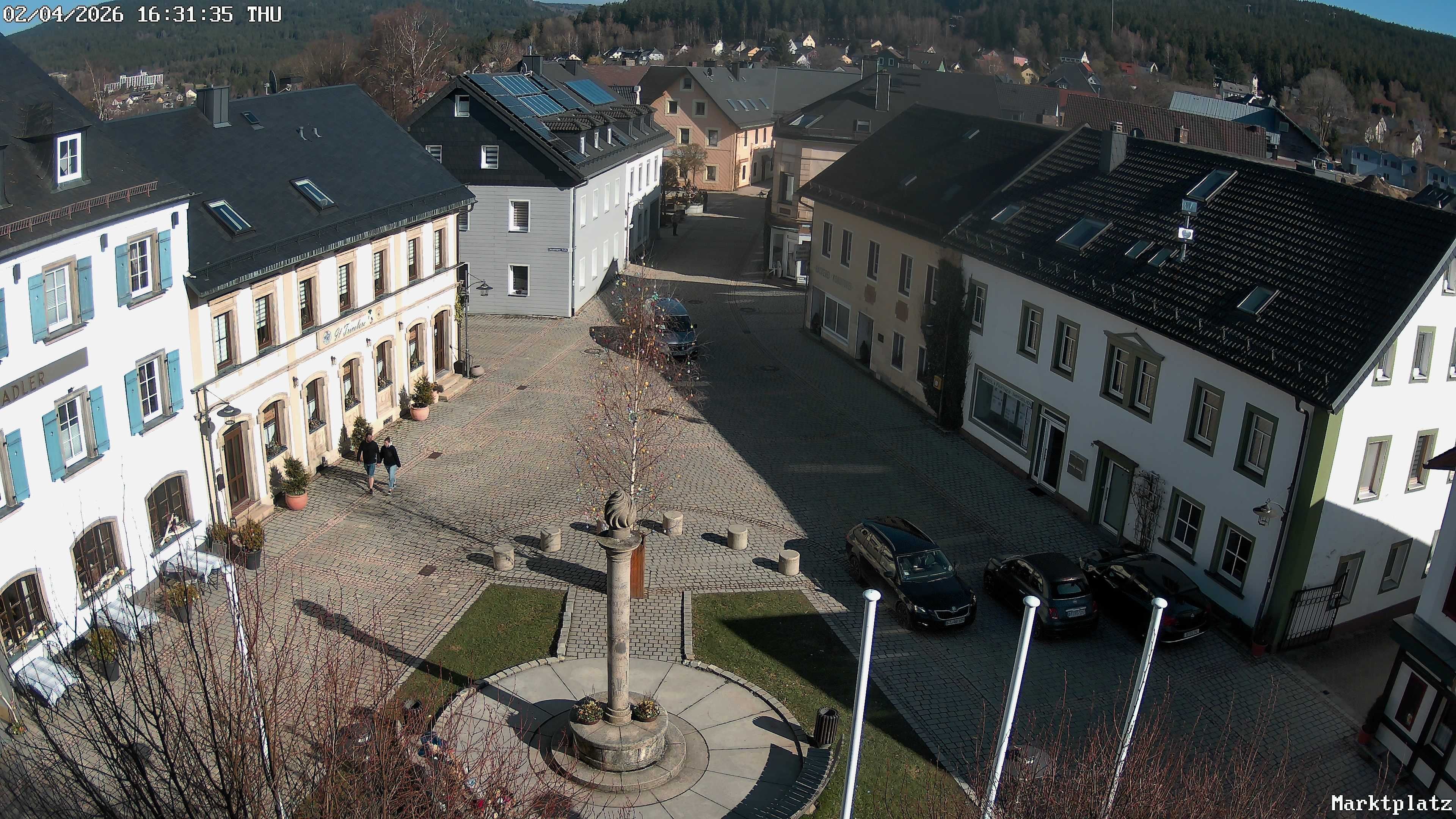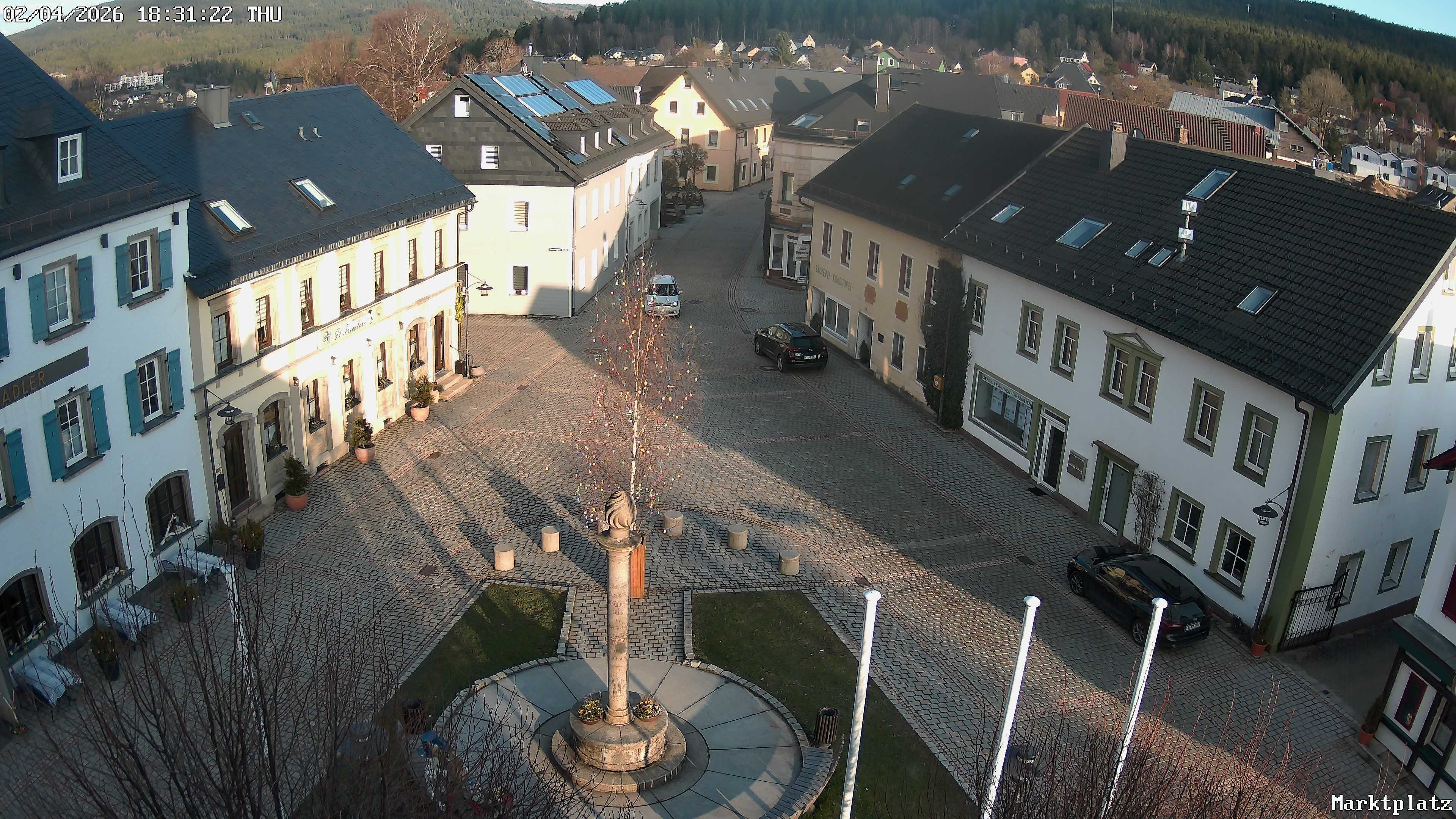 Blick über den Marktplatz von Bischofsgrün im Fichtelgebirge. Im Winter wird hier seit Jahren der größte Schneemann Deutschlands aufgebaut. Im Sommer ist der Maibaum zu sehen.