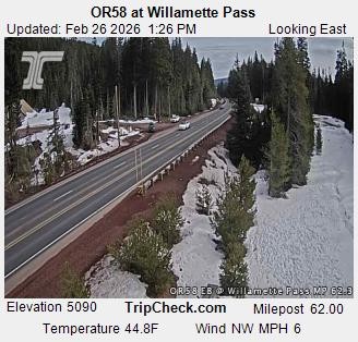 Archived webcam image showing Road Condition Cam at Willamette Pass on Feb 26, 2026 at 12:31 PM 22:00