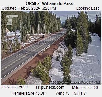 Archived webcam image showing Road Condition Cam at Willamette Pass on Feb 26, 2026 at 6:31 PM 04:00