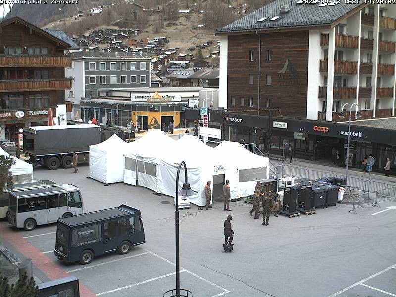 Archiviertes Webcam Bild: Zermatt: Bahnhofplatz am 13.04.2026 um 14:25 Uhr Aktuell